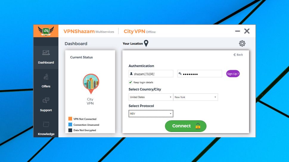 برنامه Windows VPNShazam به سرعت متصل شد ، حداقل با اولین تلاش های ما ، هنگام استفاده از IKEv2 به زیر دو ثانیه آنلاین می شود.