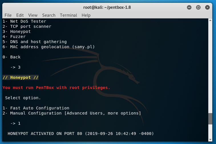با استفاده از شانه لینوکس Kali و pentbox ، شما می توانید چند دقیقه دیگر یک Honeypot را ایجاد و اجرا کنید.