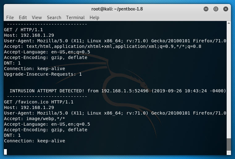 همانطور که می بینید ، pentbox این تلاش و همچنین آدرس IP منبع را ضبط می کند.