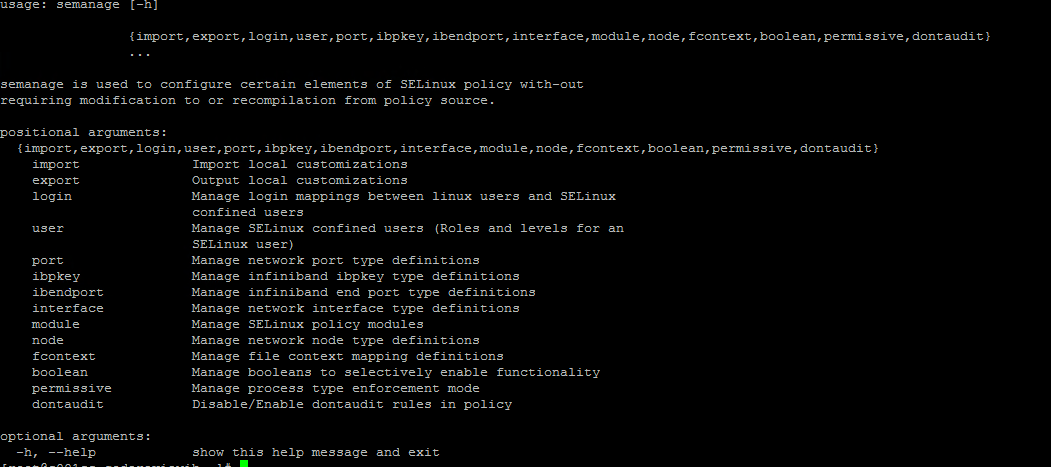 همچنین می توانید از دستورات زیر استفاده کنید تا یک صفحه دستی در مورد پارامترها و استفاده از دستور semanage دریافت کنید.