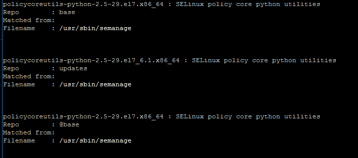 پس از کمی در تحقیقات من ، یاد گرفتم که شما باید از یام استفاده کنید ، این امکان را برای یافتن بسته ای فراهم می کند که پرونده درخواستی / usr / sbin / semanage را فراهم می کند.