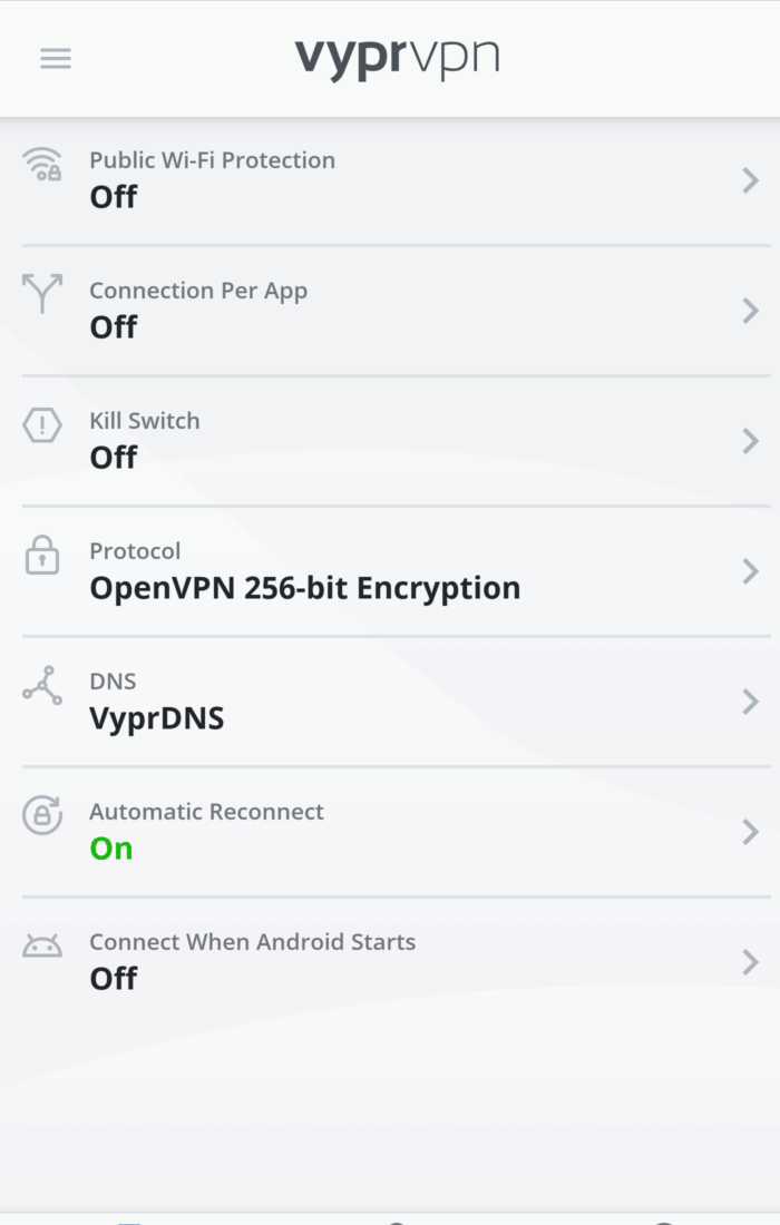 VyprVPN دارای یک صفحه اصلی بسیار ابتدایی است که از نظر طرح و ظاهر در کلیه مشتری های تلفن همراه و دسک تاپ یکسان است. یک نماد سپر بزرگ وجود دارد که نشان می دهد شما به VPN وصل هستید یا خیر ، و همچنین متنی که وضعیت اتصال شما را نشان می دهد نیز وجود دارد.