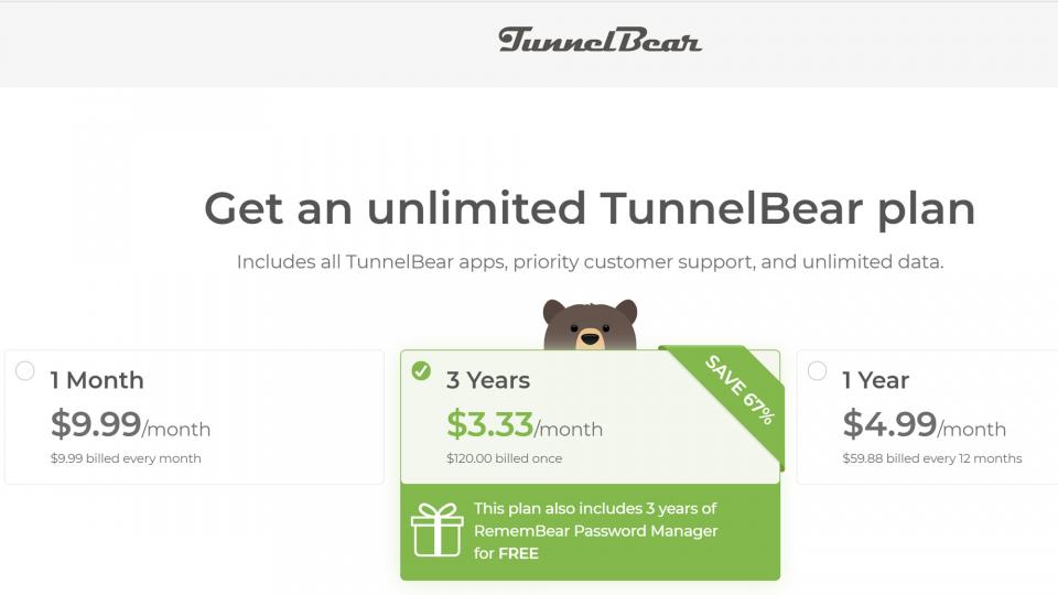 TunnelBear هزینه اگر ماهانه هزینه ای معادل 8.05 پوند (9.99 دلار) در ماه را بپردازید ، اما – مانند بیشتر VPN ها – اگر در دوره زمانی طولانی تری متعهد شوید ، برنامه های اشتراک آن ارزان تر است. اشتراک سالانه 48.19 پوند (59.88 دلار) در ماه دریافت می شود ، که در هر ماه 4.02 پوند (4.99 دلار) کار می کند ، در حالی که اشتراک سه ساله 96.58 پوند (120 دلار) یا فقط 2.68 پوند (3.33 دلار) در ماه است.