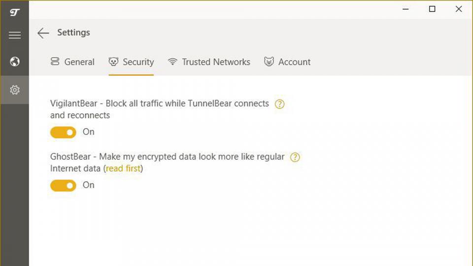 برخی از ویژگی های اضافی در فهرست تنظیمات پنهان شده اند. فراتر از گزینه های معمول برای راه اندازی VPN در هنگام راه اندازی و ارائه اعلان ها در مورد اتصال و اختلال ، می توانید شبکه های خاصی را مورد اعتماد قرار دهید. TunnelBear سپس می تواند هنگام اتصال به شبکه های دیگر به طور خودکار راه اندازی شود. اگر از طریق کانون های مختلف Wi-Fi عمومی متصل شوید ، یک اقدام معقول است. در غیر این صورت ، یک killswitch با نام VigilantBear وجود دارد و ویژگی دیگری به نام GhostBear وجود دارد که برای ایجاد ترافیک رمزگذاری شده طراحی شده بیشتر شبیه اطلاعات معمولی اینترنت است.
