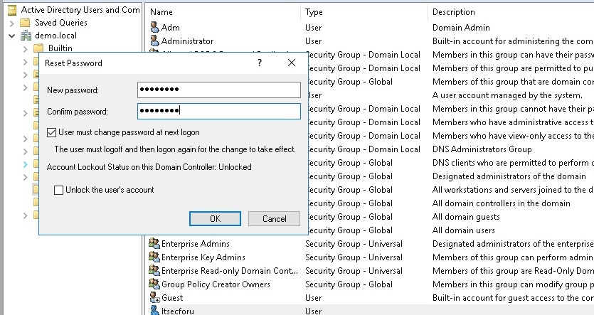 سعی می کند با اختصاص رمزعبور P @ ssw0rd ، رمز ورود را برای کاربر itecforu خود تغییر دهد ، که باید آن را با رمز عبور عادی کرده و ممنوع باشد.