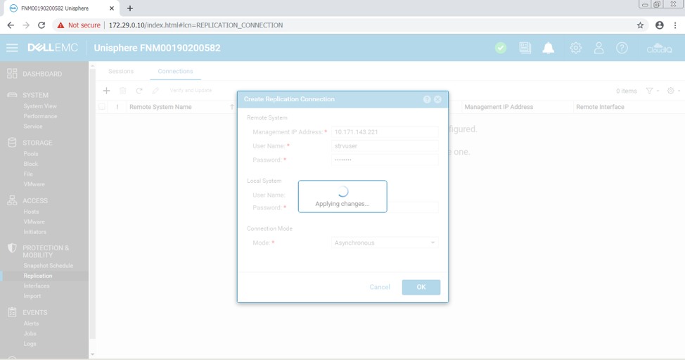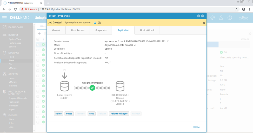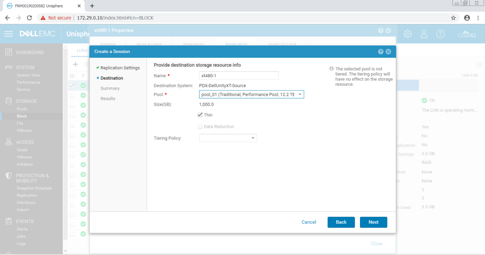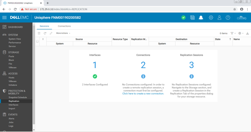 تنظیمات Dell EMC Unity XT 480F از طریق Dell EMC Unisphere انجام شده است. پس از پیکربندی رابط های شبکه ، می توانیم به پیکربندی اتصال ادامه دهیم. آنچه در ادامه می آید مراحل مستند شده در هنگام انجام این فرآیند در زمان واقعی است. تحت Protection & Mobility ، ابتدا به Replication می رویم.