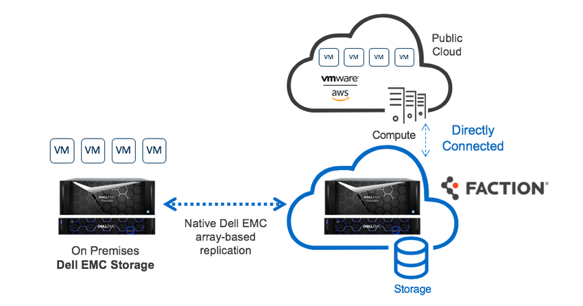 Faction's Hybrid DRaaS از طریق اتصال اختصاصی و انحصاری شبکه به VMware Cloud در AWS متصل شده و دارای تأخیر کمتر از 3 میلی ثانیه است. این سرویس دستیابی به RPO های پایین تر و RTO ها را با یک فرایند نقض و بازیابی در صورت تقاضا به یک سایت هدف سازگار و آشنا VMware آسانتر و مقرون به صرفه تر می کند. این راه حل در نهایت ترکیبی از بهترین ذخیره سازی در کلاس از Dell EMC ، محاسبه از VMware Cloud در AWS و خدمات Faction است.