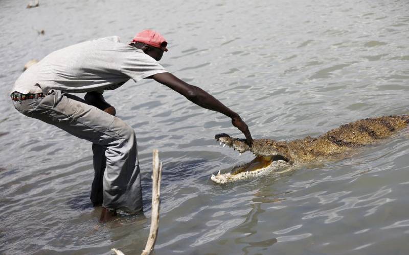 موسی Emuria یک تمساح در دریاچه Baringo تغذیه می کند. این دریاچه از جمله سایتهایی است که در ژئوشیت جهانی یونسکو پیشنهاد شده است. [File]