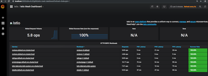 ٪ Total٪ دریافت شده٪ Xferd میانگین سرعت زمان زمان فعلی بارگذاری سرعت بارگذاری شده در کل بارگذاری کنید 0 0 0 0 0 0 0 0 0 -: -: - - -: -: - - ::: - 0 100 2254 100 2254 0 0 3994 0 -: -: - - :: -: - -: -: - - 3996metric.config.istio.io/doublequestcount ایجاد شد prometheus.config.istio.io/doublehandler ایجاد شد rul.config.istio.io/doubleprom ایجاد شد logentry.config.istio.io/newlog ایجاد شد stdio.config.istio.io/newhandler ایجاد شده است rul.config.istio.io/newlogstdio ایجاد شدهتأیید کنید که خدمات پرومتئوس و گرافانا در دسترس هستند