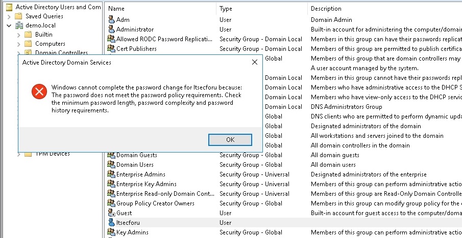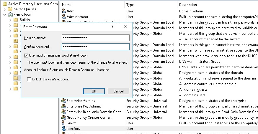 T اکنون n خط مشی فعال است ، بنابراین می توانیم کاربر آزمایش شده خود را itecforu بگیریم و سعی کنیم رمزعبور خود را به رمز عبور مجدد تنظیم کنیم ، که ، همانطور که می دانیم در ذخیره سازی رمز عبور به خطر افتاده است. ما سعی می کنیم گذرواژه را تنظیم کنیم Itsecforu.ru