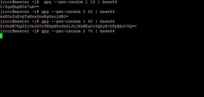 $ gpg --gen-random 1 10 | base64 $ gpg --gen-random 2 20 | base64 $ gpg --gen-تصادفی 1 40 | base64 $ gpg --gen-random 2 70 | base64