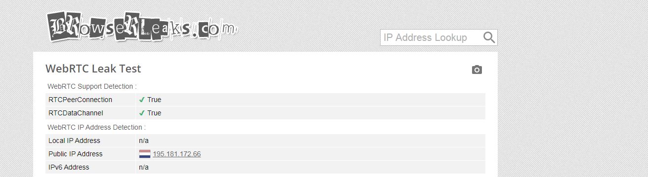 همچنین هیچ آدرس IP برای WebRTC نشان نمی دهد زیرا CyberGhost از نشت WebRTC محافظت می کند. ما همچنین از uBlock Origin برای جلوگیری از نشت WebRTC استفاده می کنیم.
