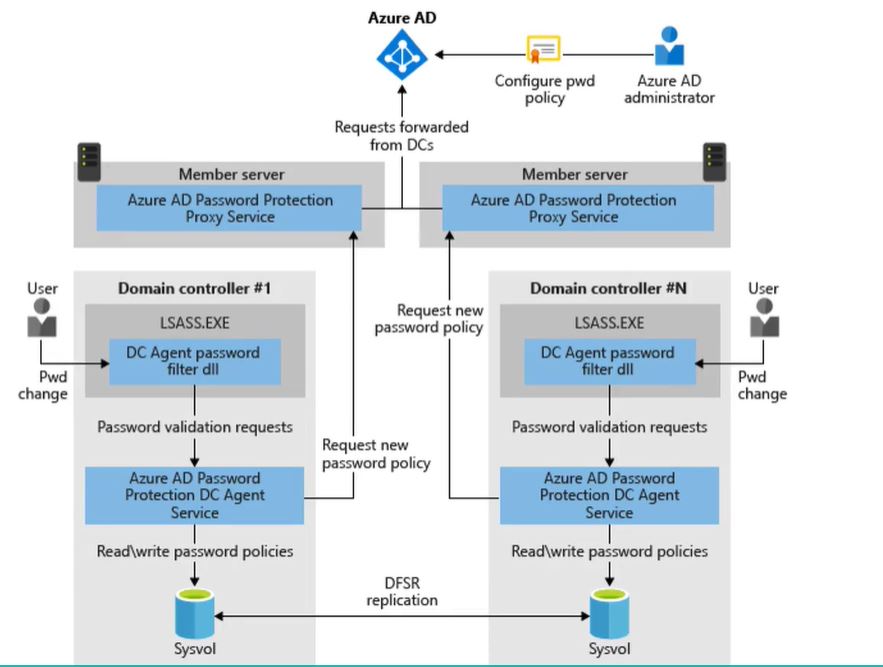 اول از همه مهم در دامنه DC لازم نیست که دسترسی به اینترنت را باز کنید ، نیازی به تمدید طرح ندارید ، هیچ الزامی برای تغییر حالت جنگل وجود ندارد. Azure AD Password Protection service در یک دامنه PC در شبکه Azure AD Password Protection Protection Proxy Service (سروری که به اینترنت دسترسی دارد ، به عنوان مثال در DMZ واقع شده است) قرار دارد ، وظیفه آن خط مشی رمز عبور را از Azure AD هدایت می کند. و آن را به هر کنترل کننده دامنه هدایت کنید و در کنترل کننده های دامنه (DC) ، یک عامل نصب شده است – AD Agent Service. نماینده خط مشی را بارگیری و تأیید می کند و هنگامی که کاربر یا مدیر گذرواژه را تغییر می دهد ، گذرواژه ها را برای مطابقت با الزامات خط مشی بررسی می کند. هر کنترل کننده دامنه یک خط مشی تنظیم شده در Azure را ذخیره می کند. در صورت عدم انطباق با الزامات خط مشی ، حتی مدیر نمی تواند رمز ورود را تغییر دهد. A zure AD Proxy Protection Password یک نقطه اتصال ویژه سرویس در AD ایجاد می کند ، از طریق این شی هر کنترل کننده دامنه می تواند Proxy Protection Azure AD Azure AD را در شبکه پیدا کند. DC Agent Service خط مشی را از طریق Proxy برای خود در Sysvol بارگیری می کند و همیشه سعی می کند هنگام شروع سرویس آن را بروزرسانی کند ، و همچنین به طور پیش فرض هر ساعت یکبار.