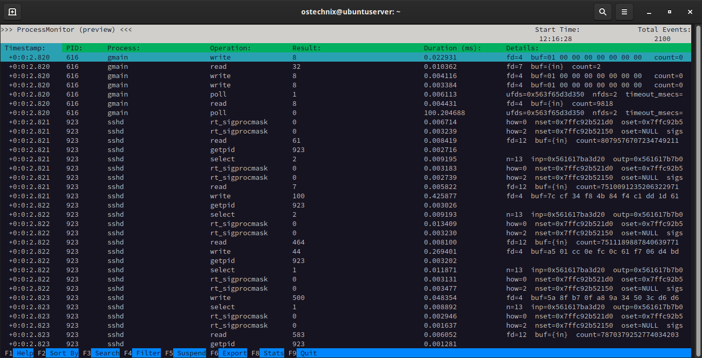 برای ردیابی تمام پردازش ها و تماس های سیستمی روی سیستم لینوکس خود ، Process Monitor را به صورت sudo یا root بدون هیچ پارامتری اجرا کنید: