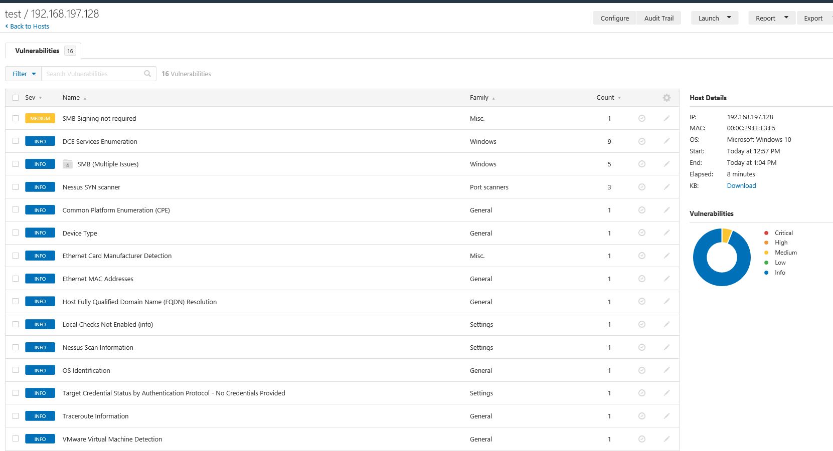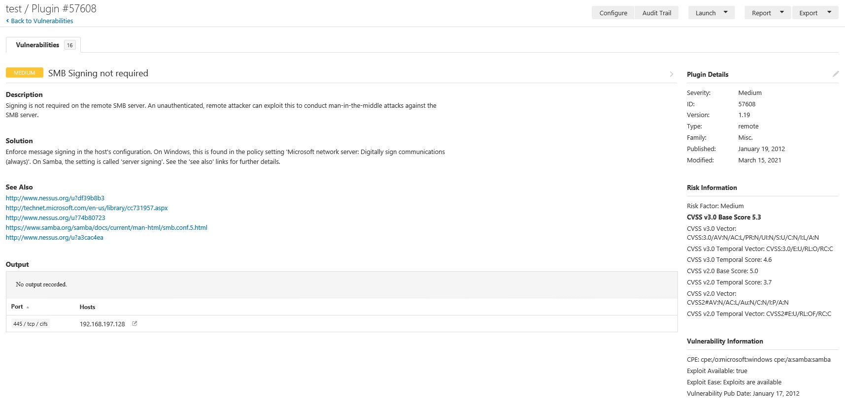 همه آسیب پذیری های موجود در میزبان نمایش داده می شود. در سمت راست ، همچنین آدرس IP میزبان و زمان اسکن را نشان می دهد. با کلیک بر روی هر پیوند ، می توانیم جزئیات آسیب پذیری را مشاهده کنیم. از تصویر زیر ، اولین و تنها آسیب پذیری SMB یافت شد که Singning مورد نیاز نیست ، بقیه برگه ها در اطلاعات ارائه می شوند – در مورد نسخه سیستم ، مجازی سازی و غیره.