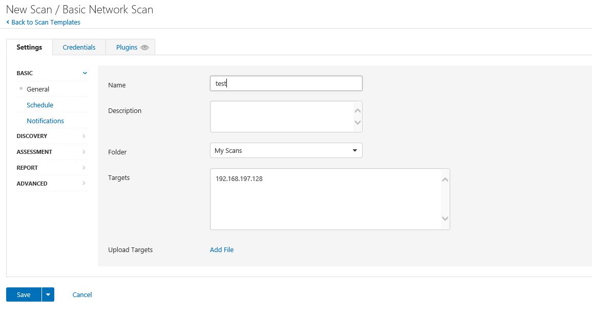 را انتخاب کنیم سپس از الگوهای ارائه شده ، Basic Network Scan را انتخاب کرده ، نام اسکن را "test" و آدرس ip هدف را وارد کنید ، در مورد من این یک ماشین مجازی در ویندوز 10 با آدرس IP 192.168.197.128